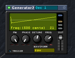Karma FX un module (clic droit, add component, generator, osc 1). Nous voici nantis d’un second oscillateur, baptisé generator 2. Branchons-le sur le filtre. On ne peut pas dire que cela bouleverse notre univers. Deux oscillateurs qui produisent le même son, cela n’est pas bien différent d’un seul. Oui mais…
